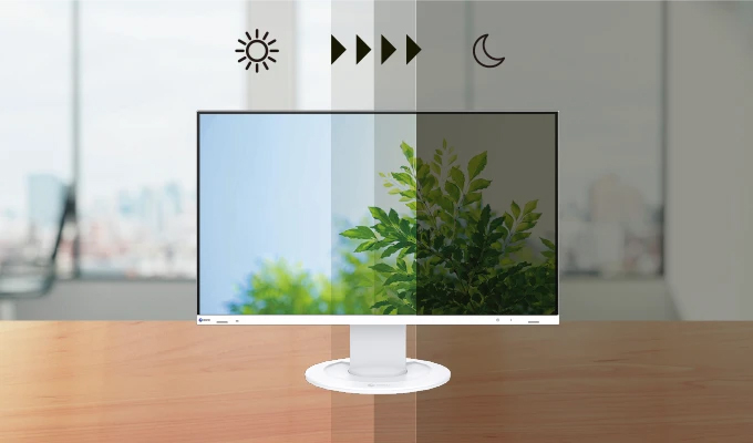 自動亮度控制為了防止眼睛疲勞,名為 Auto EcoView 的亮度感應器可以偵測全天發生的環境亮度變化,並自動將螢幕調整到理想的亮度水平。