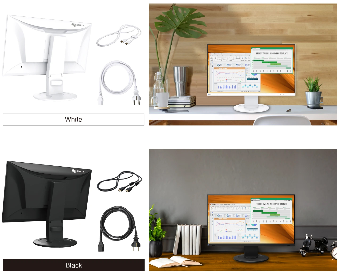 適合您工作空間的色彩選擇顯示器有白色和黑色兩種顏色可供選擇,並配有同色的支架和線材。無論您喜歡明亮、誘人的美感,還是別緻、輕鬆的氛圍,您都可以選擇最適合您的工作空間的顏色。