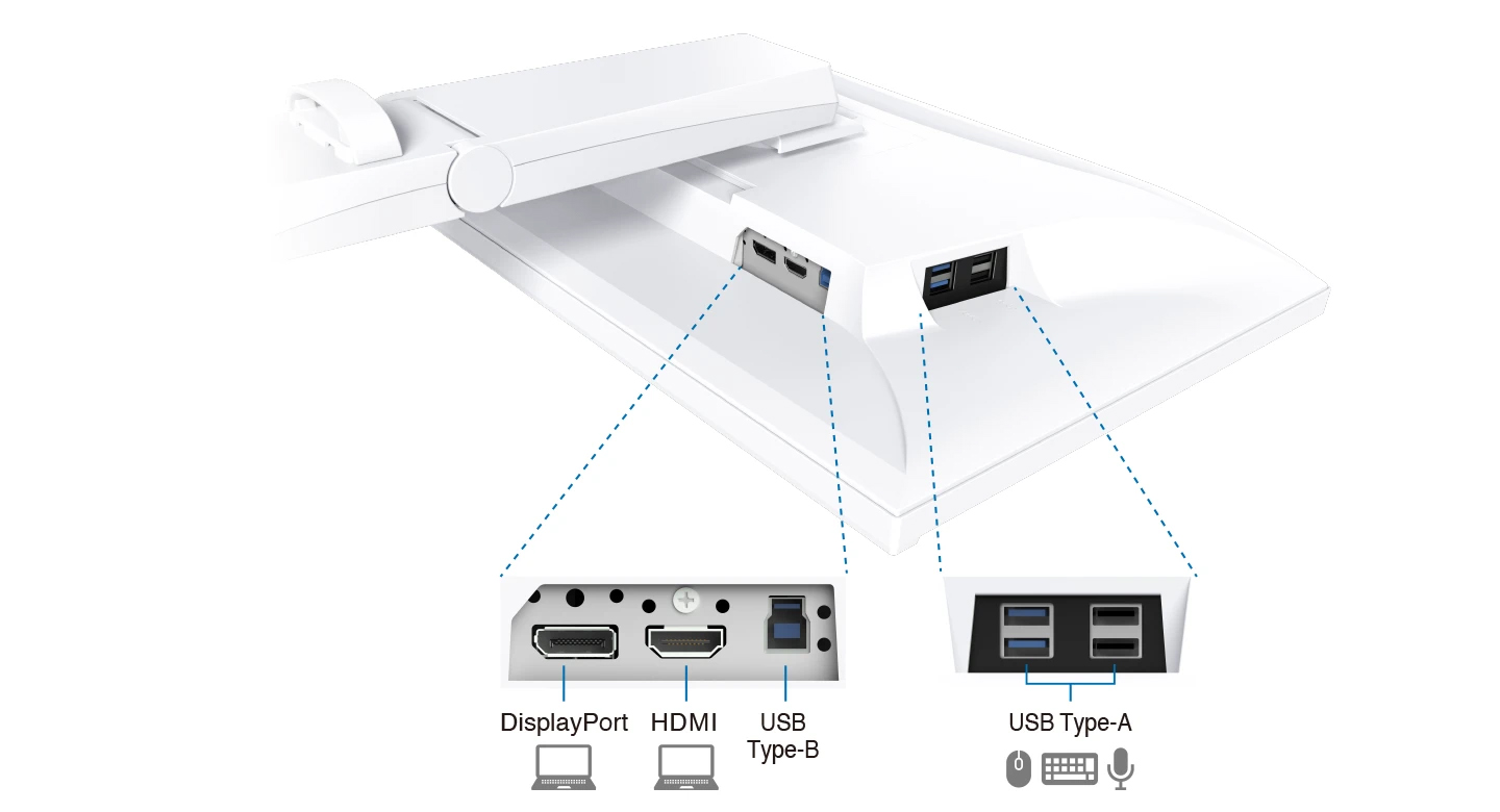 多功能連接此顯示器配備了 DisplayPort™ 和 HDMI ®輸入端口,以及四個位於側面的 USB Type-A 端口,方便連接週邊設備。