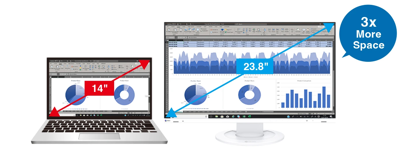提高使用環境的工作效率當23.8吋顯示器與 14 吋筆記型電腦一起使用時,可以有效的將螢幕空間增加三倍。減少了頻繁視窗滾動或切換視窗需要,更能提高了效率。